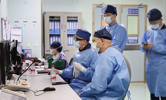 ▲ Tareq Kass-Hout副教授现场观摩手术并与席刚明教授、王贵平博士团队交流讨论