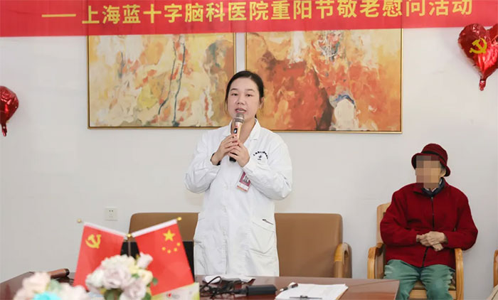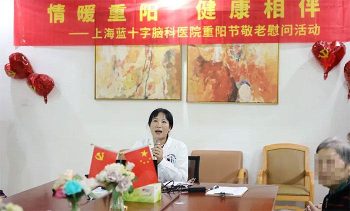 金秋十月,丹桂飘香。在中华民族传统佳节“重阳节”与第20个“世界卒中日”来临之际,为弘扬敬老爱老传统美德,守护长者脑健康,10月28日下午,上海蓝十字脑科医院“蓝小医”志愿服务队在8B脑血管病四科副主任陈泥的带领下,带着对长者的深切关怀,走进七宝敬老院,开展了“情暖重阳 ,健康相伴”主题健康慰问活动。活动由医院门诊部客服科主任罗佳主持。