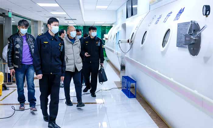 在高压氧区域,督查组重点检查了压力容器的安全运行状态。作为特种设备监管重点,高压氧舱的压力控制精度和治疗环境安全直接关系患者生命安全。检查人员仔细查阅定期校验记录、压力调节参数及密封性情况,深入了解日常巡检机制,要求医院强化细节管理,加强维护保养,定期开展压力监测与泄漏排查,确保设备运行稳定、安全、合规。