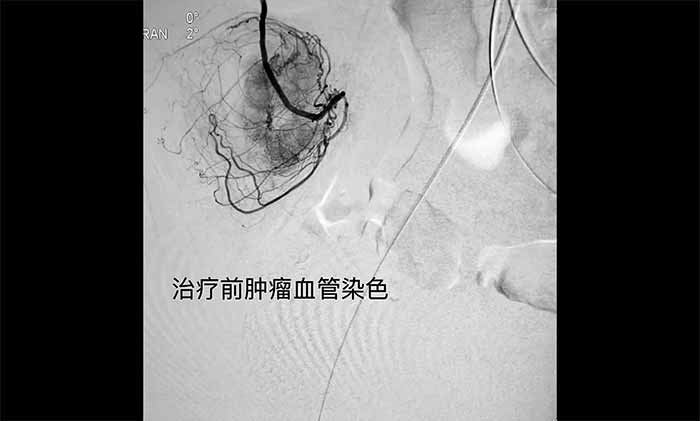术中,王永利教授联合侯安继主任、黄运星医生,首先根据造影图像,确认导管在肿瘤供血动脉分支内。经微导管灌注化疗药物,并对血管进行栓塞。完成后经微导管造影,见肿瘤血管供血和染色已明显减少。术后,便血已基本得到控制。